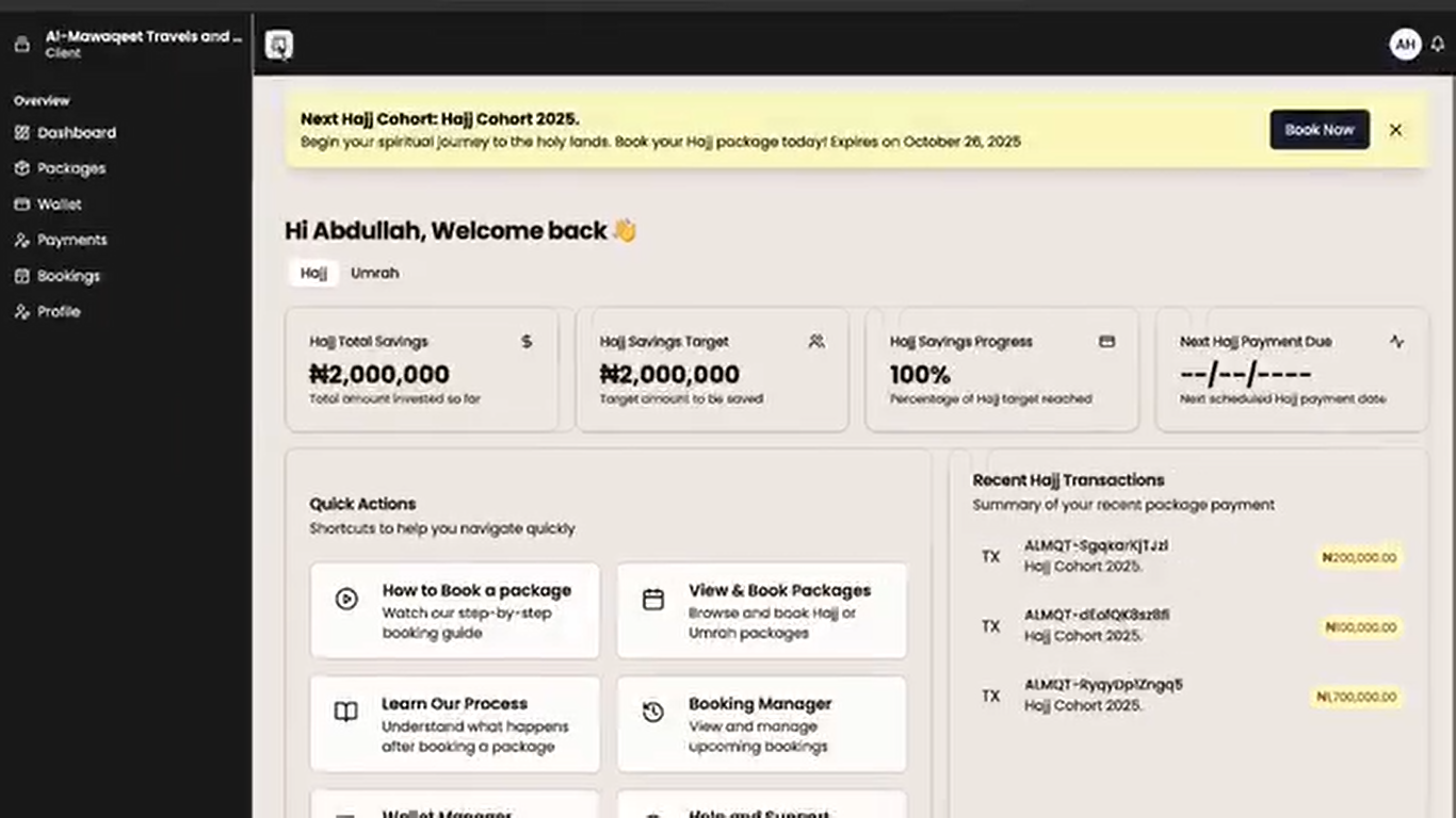 Al Mawaqeet travels and tours company wanted to expand their Hajj and Umrah booking services through an online platform. This booking website was the solution to their demand, customers can book and pay through integrated Paystack gateway. Their revenue increased by 20% within the first 4 months of use.